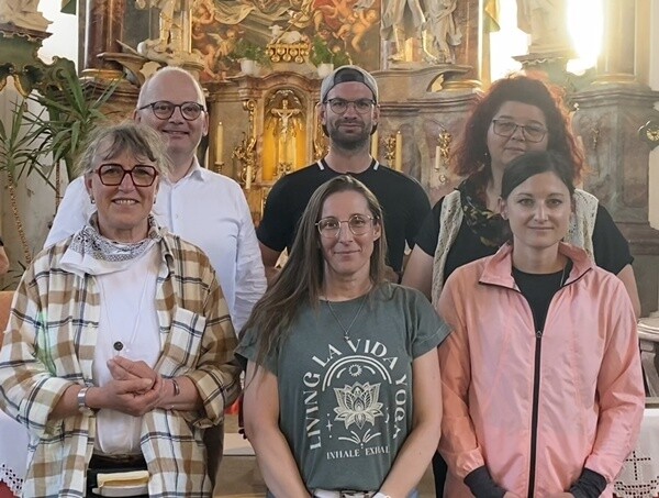 Im Jahr 1991 wurde in Eyershausen eine Wallfahrt in den oberfränkischen Wallfahrtsort Vierzehnheiligen ins Leben gerufen. Seitdem pilgern Frauen und Männer in jedem Jahr in der Wallfahrtswoche an zwei Tagen zur Basilika. In diesem Jahr gab es beim Halt im Kloster Banz auch eine Führung durch die Kirche und dazu Informationen vom örtlichen Pfarrer Josef Treutlein. Er ist ein gebürtiger Bad Königshöfer und freute sich über den Besuch der Pilgergruppe. Dann ging es weiter nach Vierzehnheiligen, wo man mit den Wallfahrern aus Sulzfeld am Abend einen Gottesdienst mit dem emert. Weihbischof Ulrich Boom feierte. Am gleichen Abend fuhr die Gruppe per Bus zurück nach Eyershausen. Hier fanden nach dem Einzug in das Gotteshaus mit Pfarrer Stephan Frank Ehrungen statt. 25. Mal waren Hermann Reder und Markus Jeger dabei. Sieben Mal Katja Umhöfer, Karin Götz, Julia Blau, Nicola Kümmel und Janine Werner. Insgesamt beteiligten sich in diesem Jahr 98 Teilnehmer, darunter 21, die zum ersten Mal dabei waren. Wallfahrtsführer ist Matthias Jeger, sein Stellvertreter Karl-Josef Schrepfer. Unser Bild zeigt von links: (hintere Reihe): Pfarrer Stephan Frank, Markus Jeger, Katja Umhöfer, (vorne): Karin Götz, Janine Werner und Julia Blau.