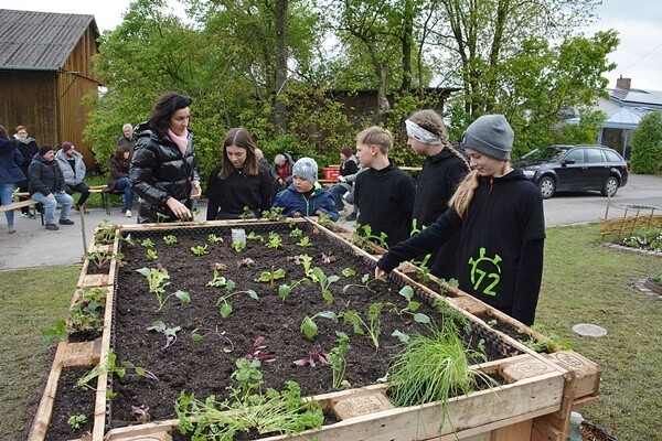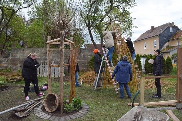 Aus einer einfachen Wiese wurde ein Schmuckstück für die Allgemeinheit. Ein Hochbeet entstand ebenso wie eine gemütlich Sitzecke. Ein Weidentipi ragt in die Höhe, ein Insektenhotel wurde gebaut, bienenfreundliche Pflanzen gesetzt, ein Nistkasten hängt am Baum und sogar ein Snack Garten sowie und ein Sandbad für Vögel wurden angelegt. Auf beschrifteten Steinen ist nachzulesen, was im kleinen Kräutergarten wächst und die Kinder haben selbst Gehwegplatten aus Beton gegossen und entsprechend gestaltet. „Es hat richtig viel Spaß gemacht… Der Garten ist wunderschön und gemütlich geworden… Wir wurden zwar oft bis auf die Unterhosen nass, aber das hat sich gelohnt,“ waren ihre Kommentare.