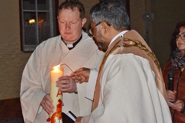 Nach dreitägigem Schweigen läuteten zum Gloria die Glocken und die Orgel stimmte in die Osterlieder ein. Pfarrer Joe sagte zur Auferstehungsgeschichte, dass man den Stein, mit dem das Grab verschlossen war, mit Steinen im Leben eines jeden Menschen vergleichen könne. Auslöser solcher Steine könnten Mitmenschen ebenso sein, wie Ängste oder traumatische Erfahrungen eines jeden Einzelnen. In der Auferstehungsgeschichte sei das so zu deuten, dass Gott diesen Steine weg wälzt, „damit das Leben in uns wieder zur Blüte kommen kann.“ Oftmals seien es Menschen, die hier helfen, aber auch der Mensch selbst, der diese Steine aus dem Weg räumt. Wer das verinnerlicht könne ein österlicher Mensch werden und so sein Leben neugestalten,