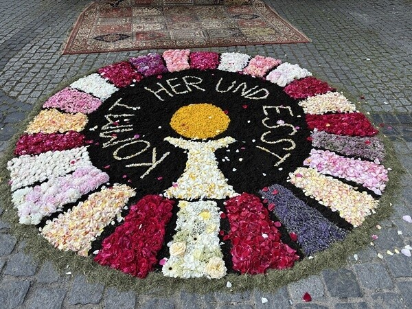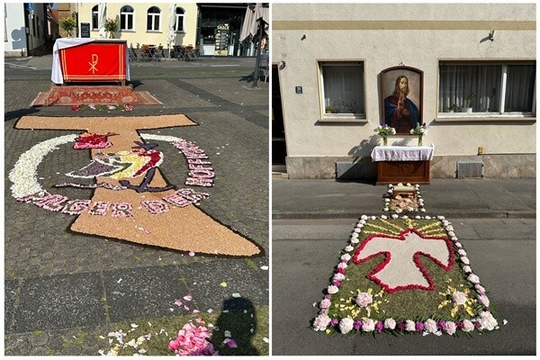 Das zeigte sich auch in diesem Jahr. Zwar hatten die Kommunionkinder viele Rosenblüten gesammelt aber trotzdem musste noch für den Innenbereich des Teppichs Blumenerde verwendet werden. Gras und Sägemehl sah man beim Teppich der Firmlinge und ebenfalls Sägemehl verwendete der Pfarrgemeinderat mangels Blumen. "Wunderschöne Teppiche... vor allem der an der Apotheke sticht durch seine Farbenpracht heraus, aber auch die Firmlinge haben einen tollen Teppich gelegt. Der größte Teppich war dann traditionell am Marktplatz in Bad Königshofen zu sehen, davor ein mit einigen Blumen geschmückter Grasweg, der zum Altar führte.