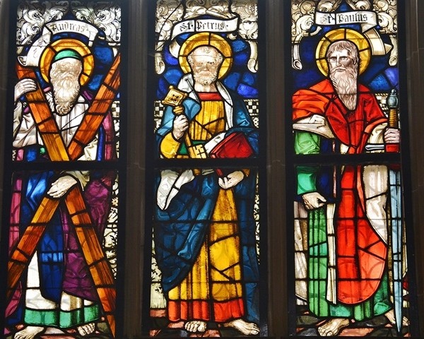 Doch zurück zu den Kirchenfenstern. Geläufig sind in der Bibel zwölf Apostel, Bad Königshofens Stadtpfarrkirche hat jedoch dreizehn. Simon Petrus, Andreas, Jakobus der Ältere, Johannes, Philippus, Bartholomäus, Thomas, Matthäus, Jakobus der Jüngere, Judas Thaddäus, Simon Zelotes und Matthias. Dieser wurde nach dem Tod von Judas Iskariot, der Jesus verraten hatte, in die Gruppe der Zwölf aufgenommen. Kurze Zeit später lässt sich Paulus taufen und wird Christ. Er spricht von sich selbst als Apostel. "Und so gibt es einige Kirchen, in denen 13 Apostel abgebildet sind, weil Paulus mitgezählt wird." So eben auch in der Stadtpfarrkirche in Bad Königshofen. Mit ihm sind Andreas und Petrus dargestellt.