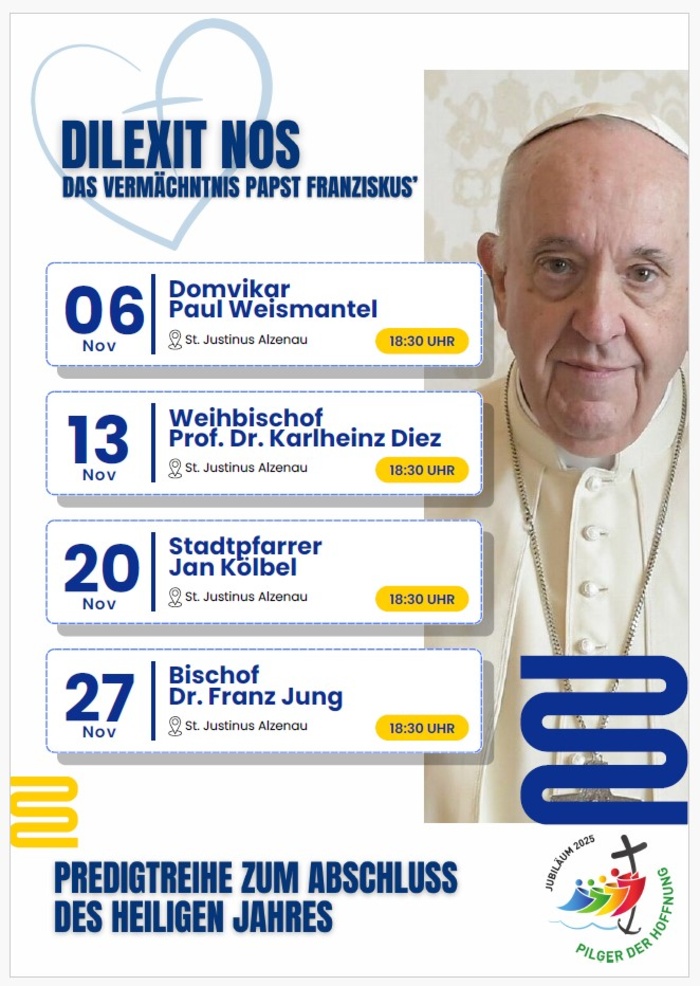 Herzliche Einladung zu vier besonderen Predigten im November in der Pfarrkirche St. Justinus Alzenau. Gemeinsam wollen wir auf das Vermächtnis von Papst Franziskus schauen und uns inspirieren lassen, seinen Aufruf zur gelebten Nächstenliebe im Alltag umzusetzen.